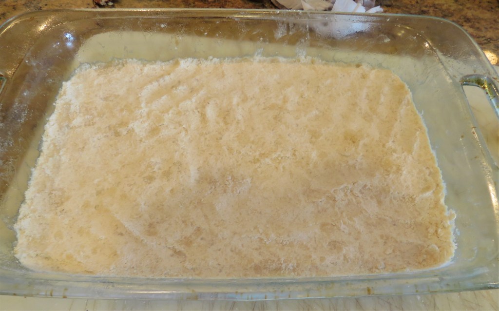 Place all the ingredients together in bowl and mix until it all resembles coarse sand. Then pour it all into the prepared baking pan and firmly press it into the pan forming an even crust.