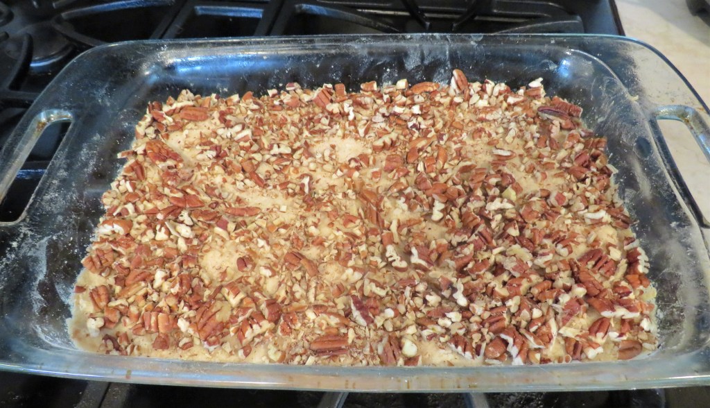 When the crust is ready, remove it from the oven and evenly spread the chopped pecans over the crust.