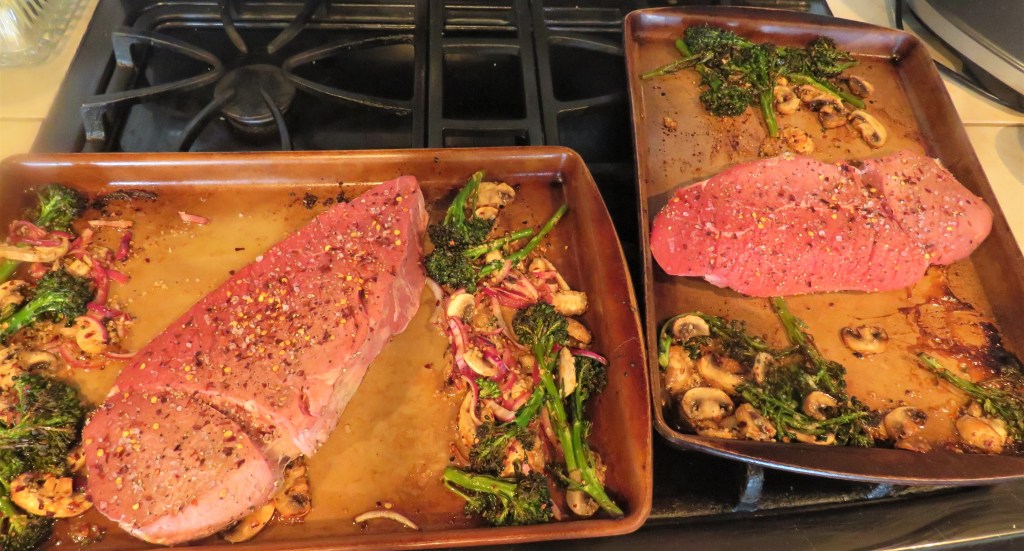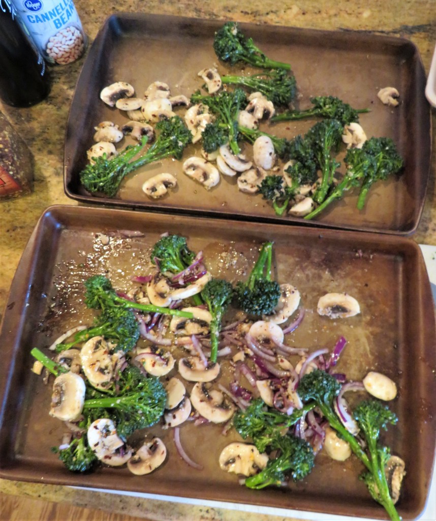 This dish is an easy one-pan dish that is all roasted in the oven at 450* F or about 235 *C. Start by roasting the broccolini, mushrooms, garlic, and onions tossed with olive oil, lemon balsamic vinegar and red pepper flakes (for ours only, and optional) for 15 minutes, then add the seasoned skirt steak and continue roasting for about 5-7 minutes per side, for a nice medium rare steak.