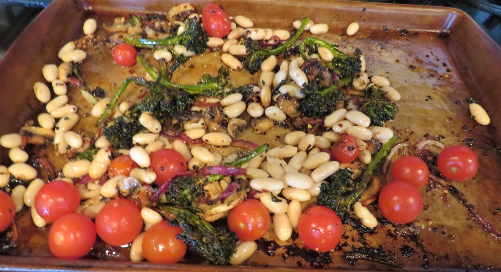 After the steak was cooked, I let it rest for about five or so minutes before slicing it, but added the tomatoes and cannellini beans to the vegetable mix and let them roast for about 5-7 minutes.