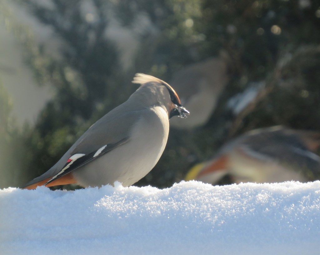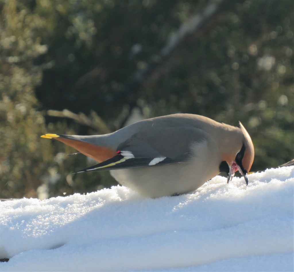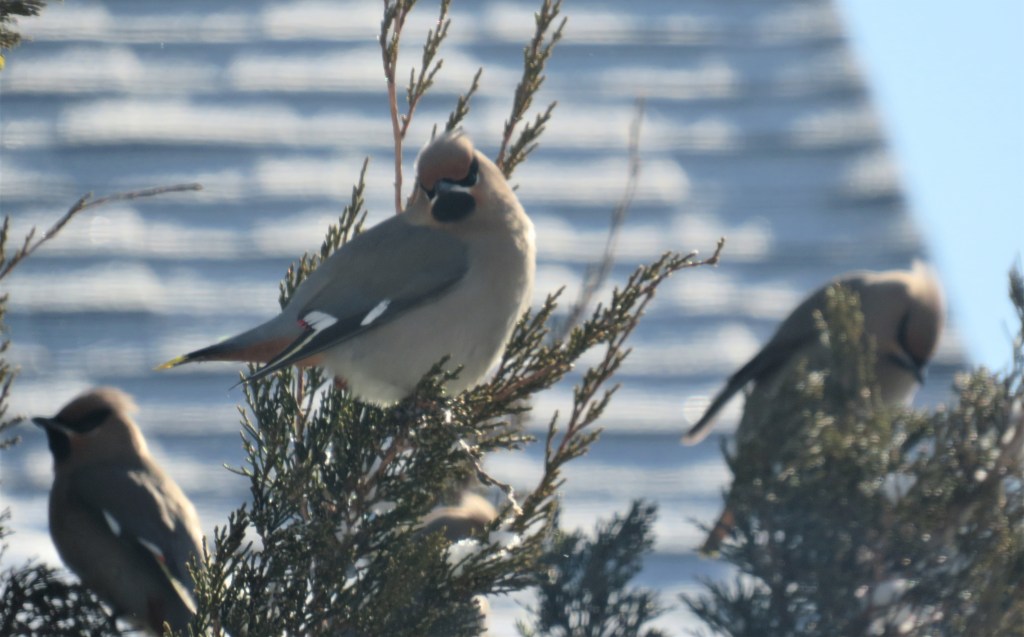 I met a new feathered friend this morning, from the comfort of my own office. There were 100’s of them on my roof and in the trees. My new friend is a Cedar Waxwing. They were flocking towards my Juniper tree.