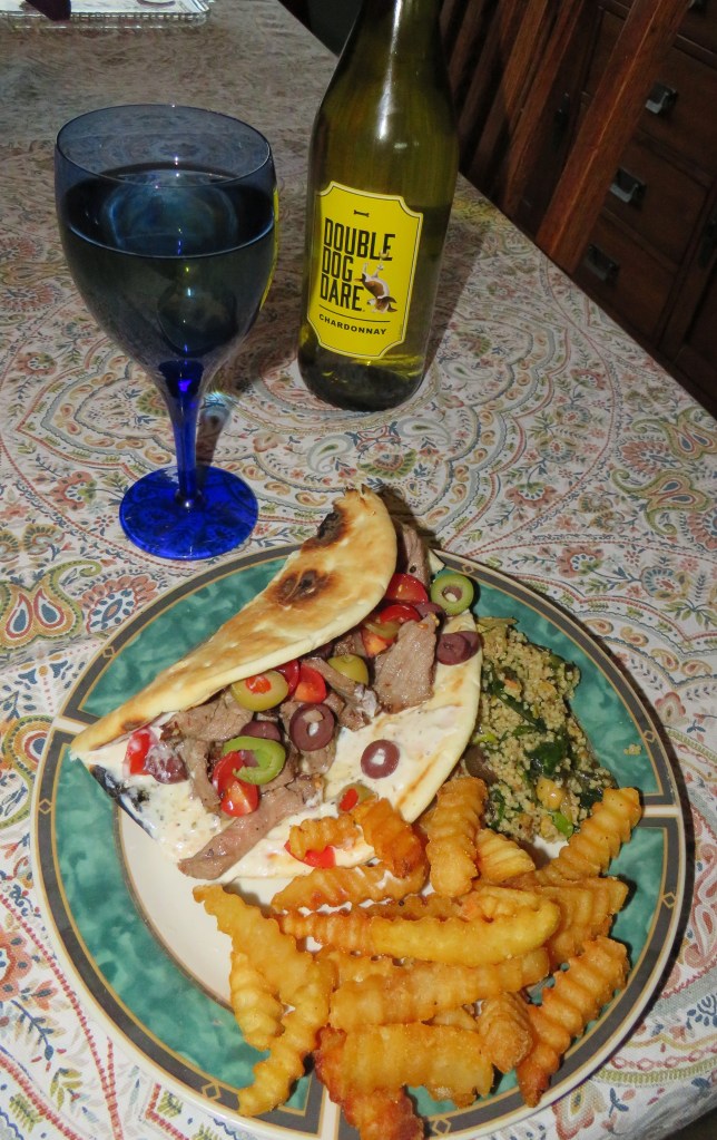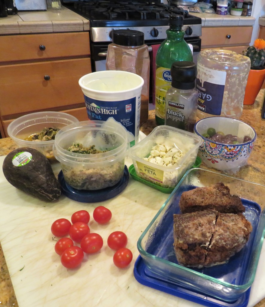 This quote sums this line of thought up perfectly, though we did pretty well last night. I turned some left over steak and olives into gyros with a mixture of Mediterranean salads to make a couscous salad. If you didn’t know better, you might think I planned out this meal ahead of time. πŸ™‚