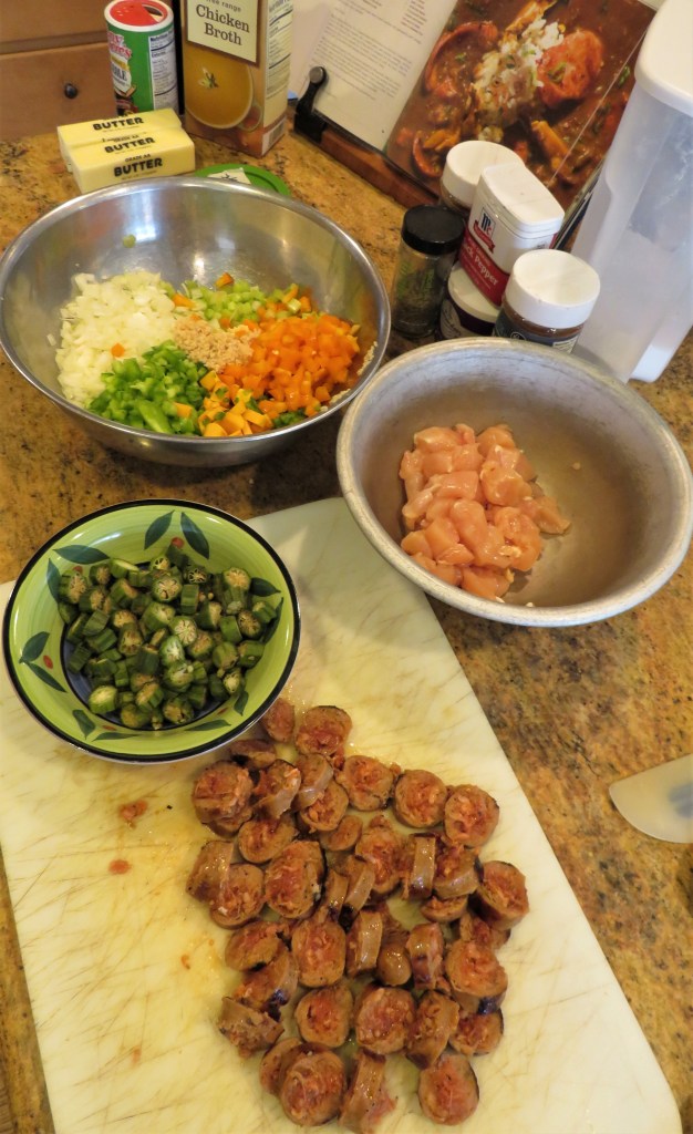 The basic recipe for successfully making a good gumbo is to start with the Holy Trinity in New Orleans’ cooking, which is onions, green bell peppers, and celery. From there, the only other rules are to use what you have on hand and/or what’s in season, make a good flavorful stock and a roux, then add the meat, chicken or seafood for your flavor profile.” Cooks everywhere borrowed from all around, used what they had and made everything work together”. (Kit Wohl) As you all know, this is most definitely my way of thinking and cooking too.