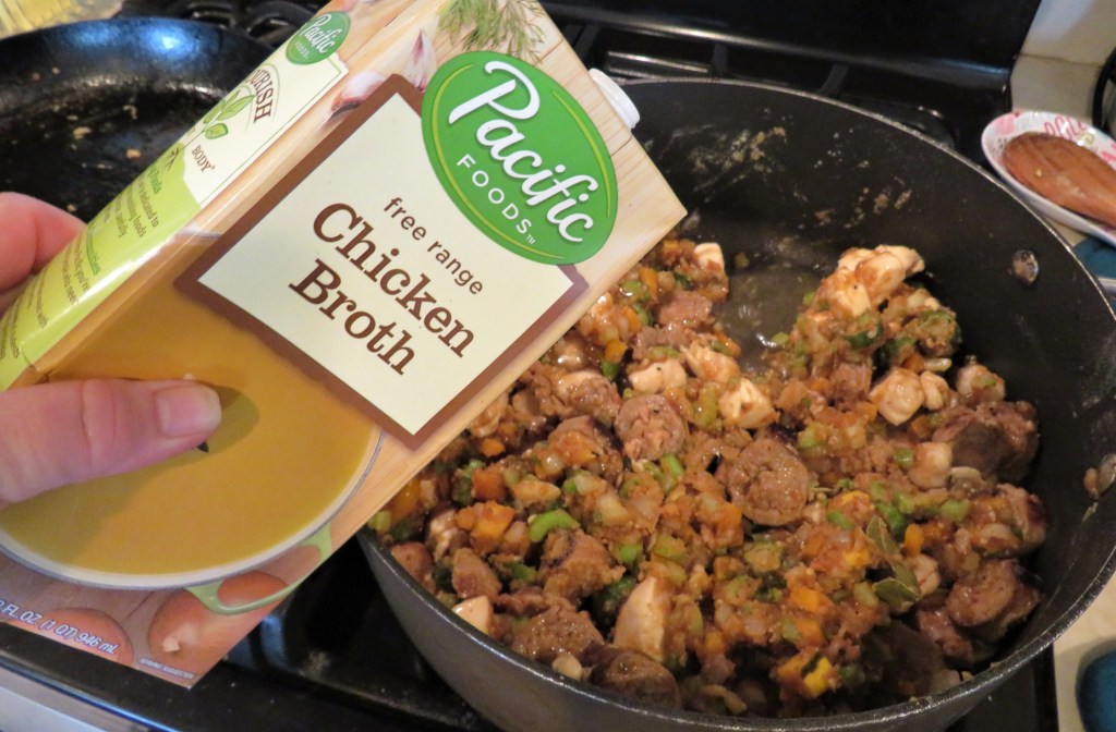 When the chicken and sausage are completely cooked, combine them with the roux and vegetables and mix thoroughly. Then add the chicken stock and seasonings.
