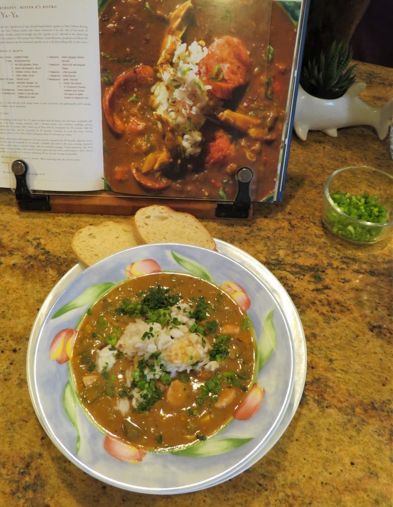 As you can imagine, there is NO one type of gumbo and as mentioned above. EVERYONE seems to have their own recipe that is “the best”. The particular gumbo I made last night is known as Gumbo Ya-Ya, from the recipe of the famous Brennan’s Restaurant in New Orleans. Legend has it that the term “gumbo ya-ya” comes from a French dialect that was spoken in New Orleans during the 1800’s. Other theories say that the term “gumbo ya-ya” referred to all the women’s chatter in the kitchens while they were cooking the meals. Who knows? All I know is that it is delicious. π