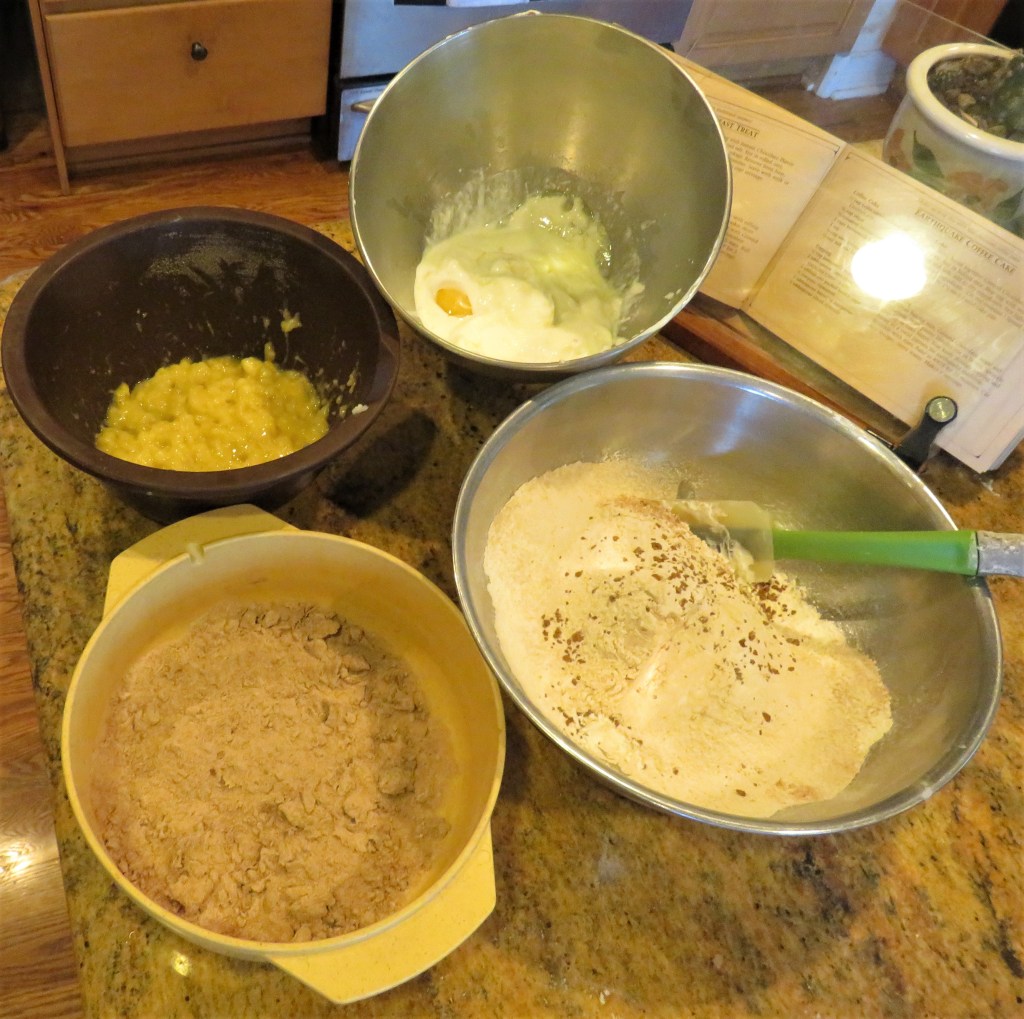 Alternate the flour mixture and bananas, adding 1/2 at a time and mixing in between each addition.