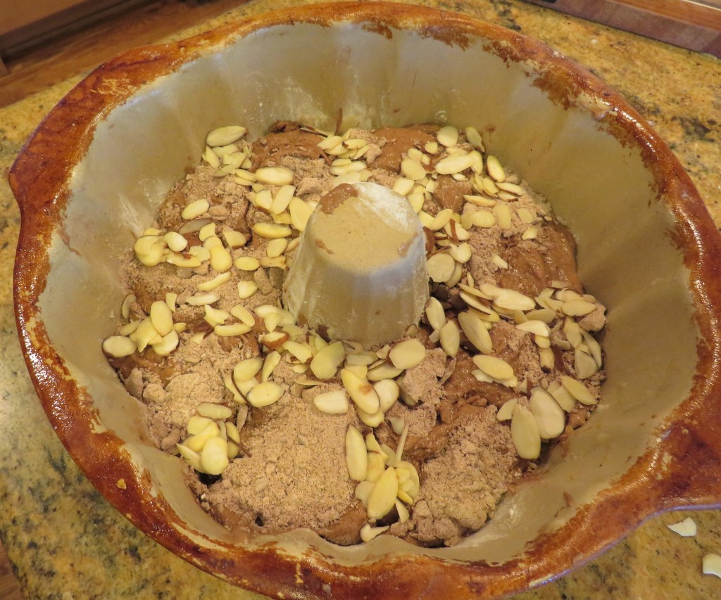 Spray cooking spray and dust your cake pan with flour. I used a bundt pan this time, but a 9×13 pan is great too. The recipe actually called for a 9″ cake pan. Whatever pan you use, you want to make sure it is a deep pan though, because your cake will definitely “explode”.