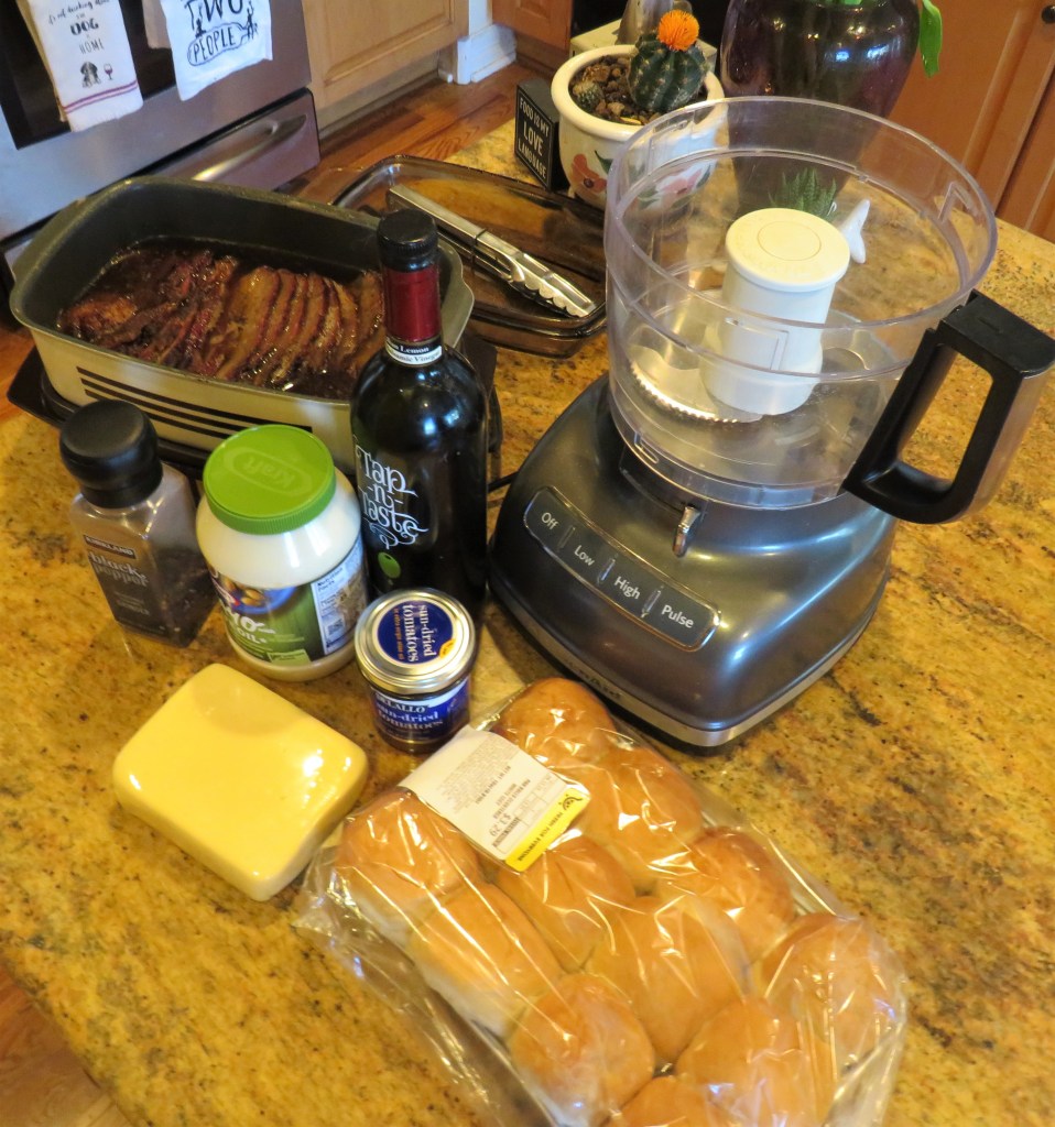 This time, I turned my brisket into sliders. But my sliders needed a sauce to go with them, so I made a sun-dried tomato aioli that complimented the beef brisket perfectly. I also brought along some Havarti cheese to top the sliders for all the cheese lovers. Not being a cheese eater, I stopped at the cheese section of my local grocery store and told the cheese expert what I was making and asked what the best type of cheese would be to go with my sliders. She is the one who graciously explained the different properties of the cheeses she thought would go best with my sliders and we decided on the Havarti.