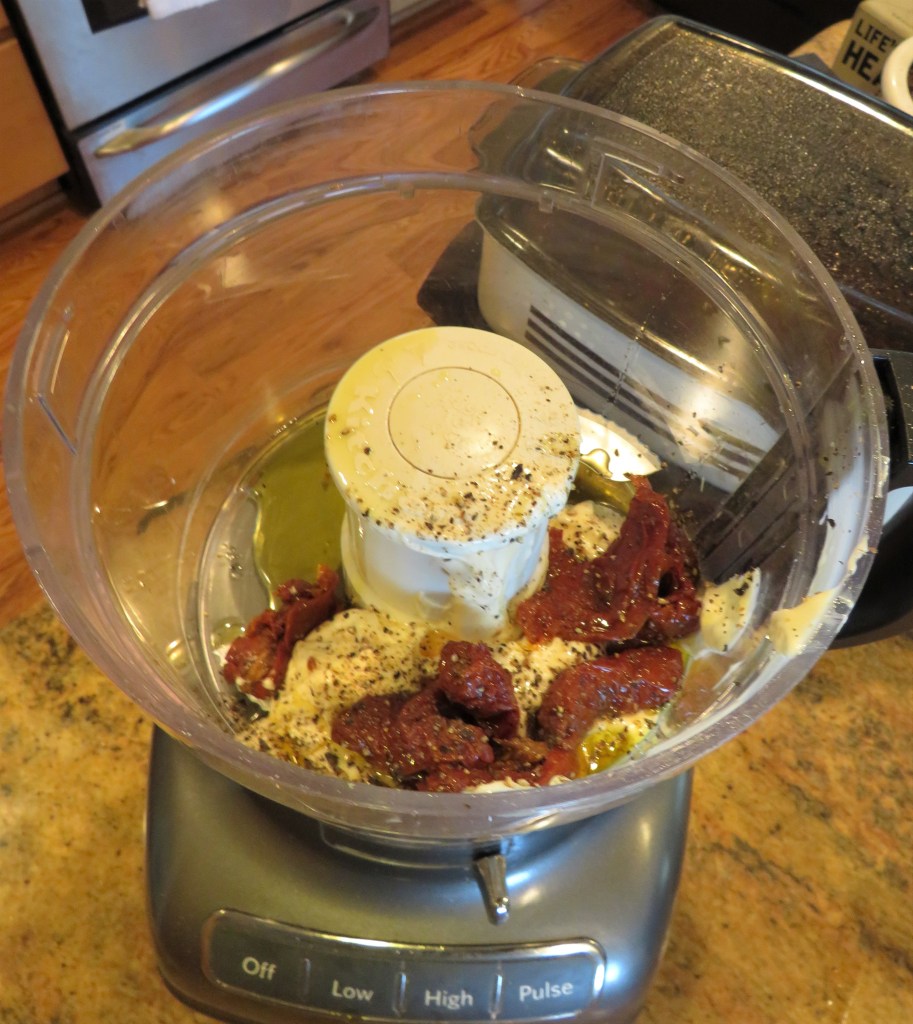 The sun-dried tomato aioli was super easy to make and very tasty. I just put all the ingredients into the food processor and mixed it all up until it was smooth and creamy.