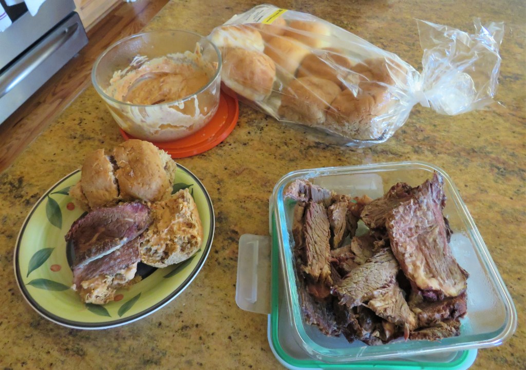 When Larry smoked the brisket on Easter Sunday, that was just the beginning. But it was not quite done. The flavor was delicious, however, it was still tough and needed more cooking. So I cooked it in the slow cooker with beef broth for about 5 hours. Then it was ready. It came out so juicy and tender. It just melted in our mouths.
