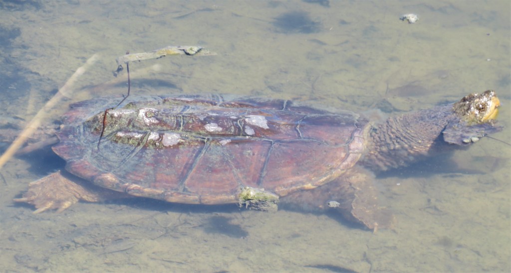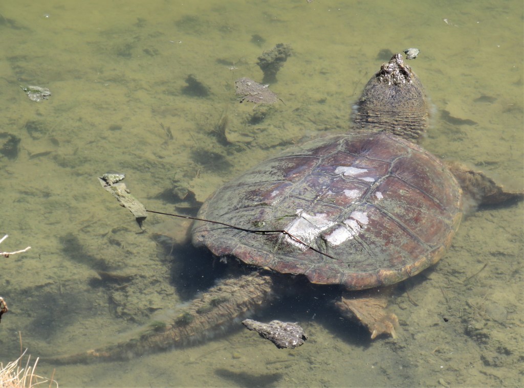 You know spring has sprung in my neck of the woods when the weather gets warmer and my turtles start coming out to sun themselves. I have seen a few turtles already, but they have been camera shy. Today, however, I had a fairly large snapping turtle just enjoying himself and soaking up the sun.