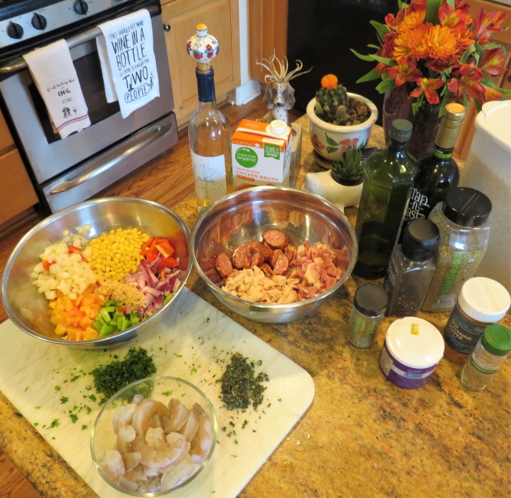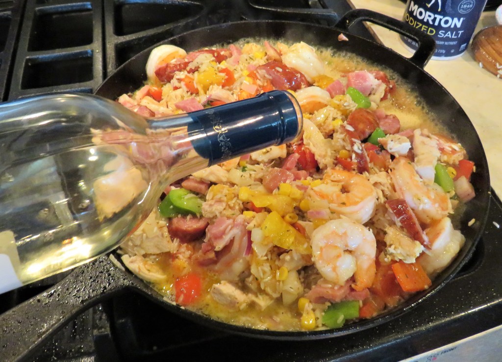 This paella was similar to many other paellas I make. It was loaded with all kinds of good things; Andouille sausage, chicken, shrimp and ham, along with lots of vegetables and, of course, rice.