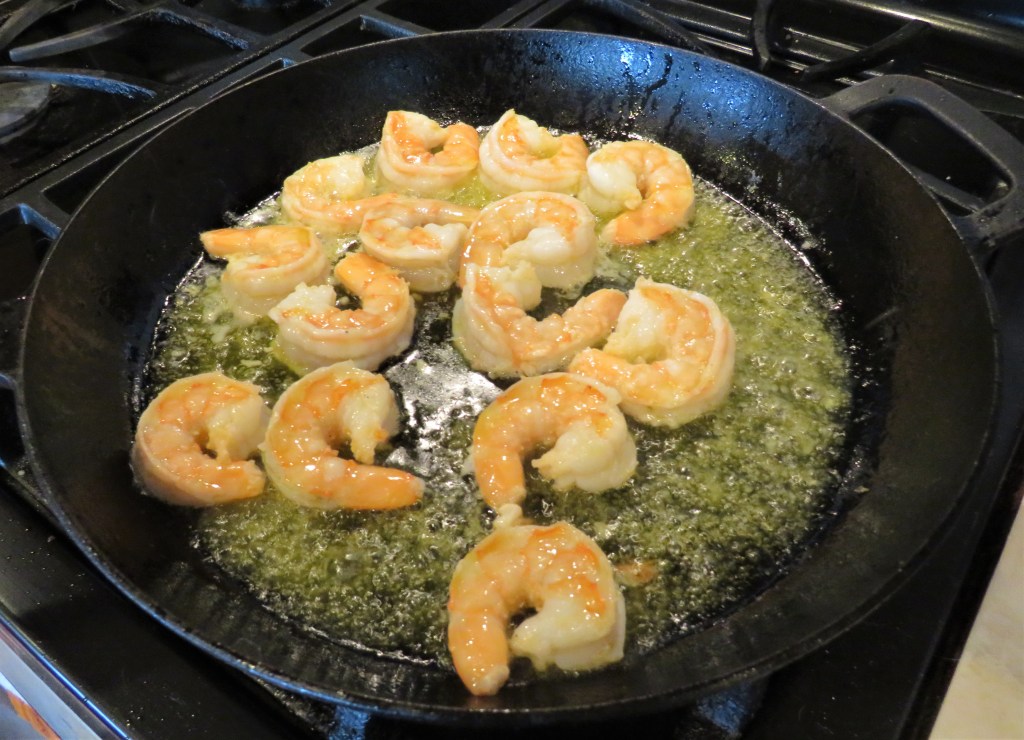 All my meats except the shrimp were already cooked, which made this dish even easier to make. So, first thing to cook was the shrimp. I cooked it in a combination of olive oil and lemon olive oil.