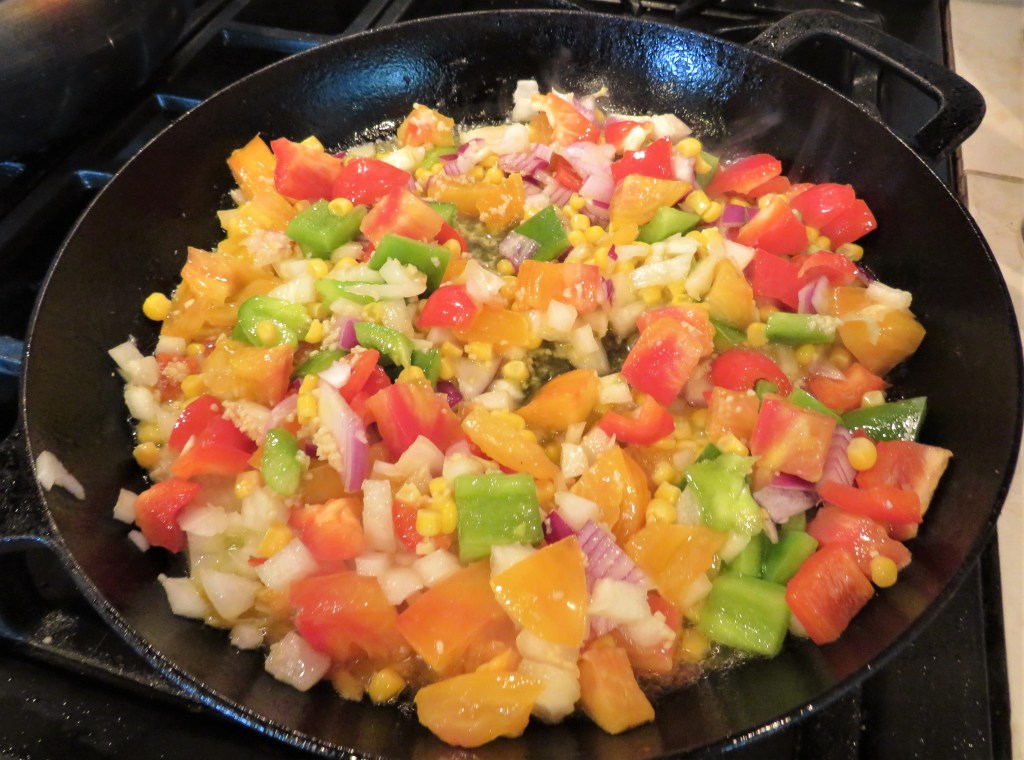 Once the shrimp was cooked, I removed it from the heat and cooked the vegetables. Then I added red and green bell peppers, onions, corn, garlic and a very large yellow heirloom tomato. MMMMMM! I love heirlooms. They are my FAVORITE tomatoes, but I digress. 🙂