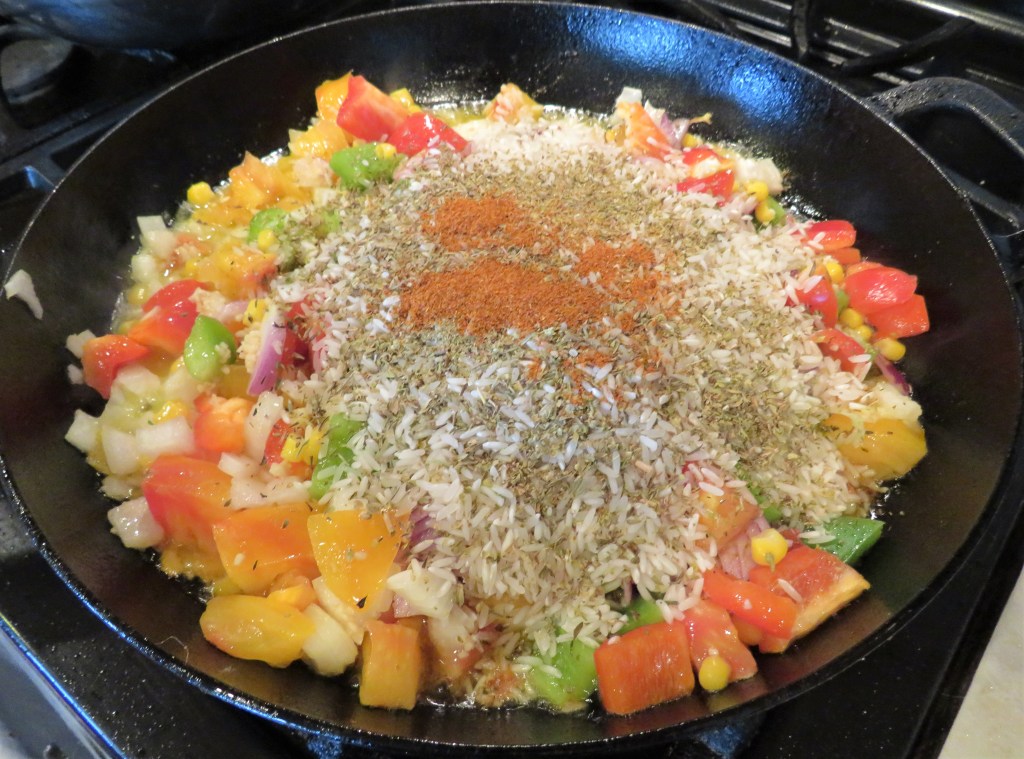 I added the rice and the seasonings after about five minutes and sauteed it in with the vegetables.