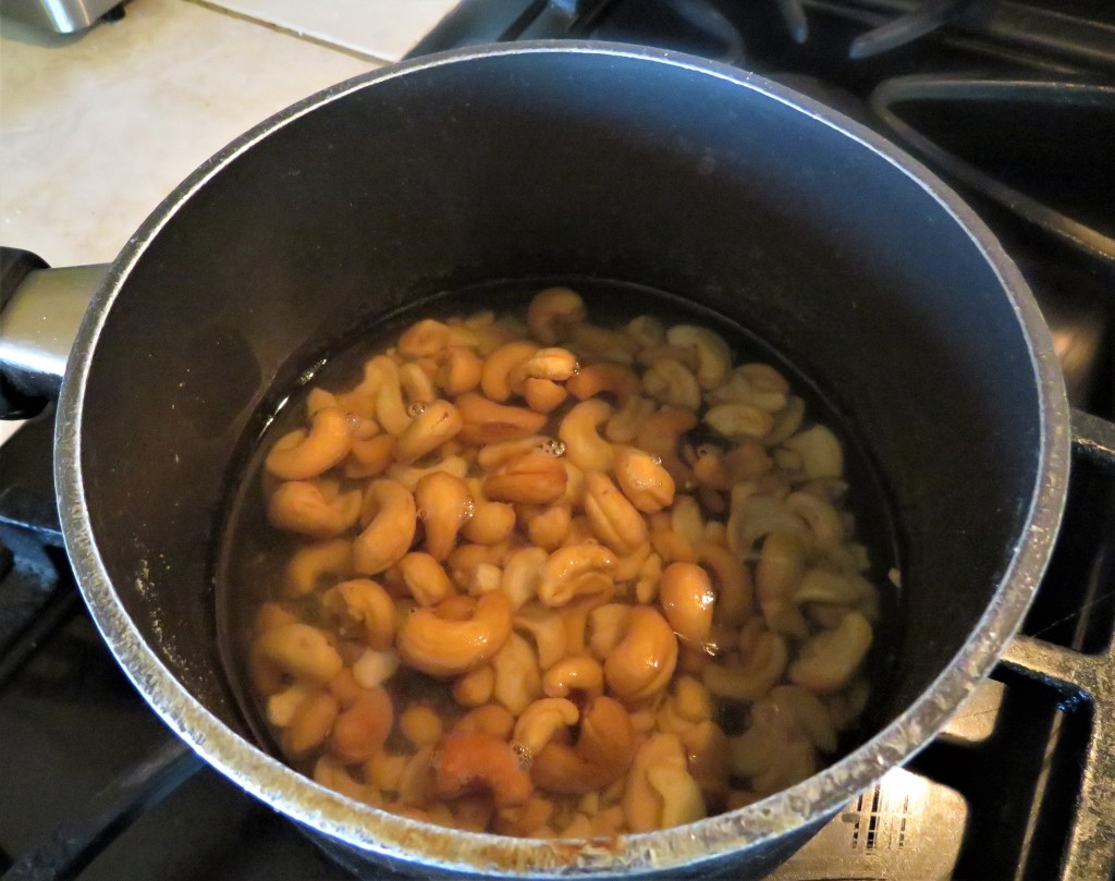 Bring 2 cups of water to a boil. Once it starts to boil, turn the heat off and add the cashews. Let them soak for at least an hour.