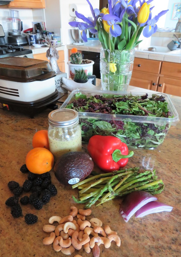 Because we eat so many salads in the warmer weather, I am always looking for something different. I like a lot of variety, both in my salads and my dressings. I also like a lot of color and different textures. This new summer salad is a definite winner, and meets all my salad requirements. It’s very colorful. It has a lot of different flavors and textures, and most importantly, it tastes really good too. I call it my summer sunburst salad. I served it with a vegan creamy cashew and orange dressing too. As is, this whole salad is vegan, but if you want to make it more of a main meal, all you need to do is add either shrimp, salmon or chicken, and you’ve gone from a vegan side salad to a main meal.