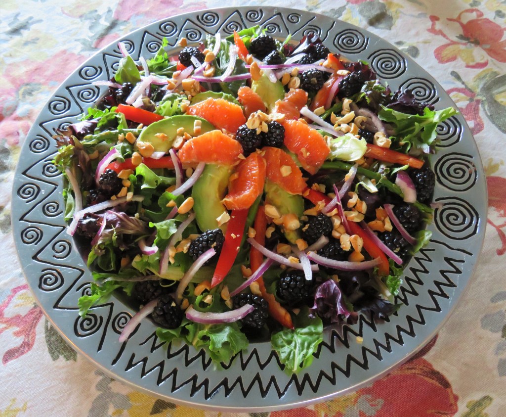 Start with a layer of the mixed baby greens then arrange all the rest of the ingredients on top to make a bright, colorful sunburst. Start with the avocado slices, then add the orange segments. Add a few blackberries in the center, and then sprinkle the rest of the ingredients around to really make the salad pop. You can use any kind of dressing you like, but I served it with a creamy orange and cashew dressing, also vegan. I actually made the dressing first, then created the salad around the dressing.