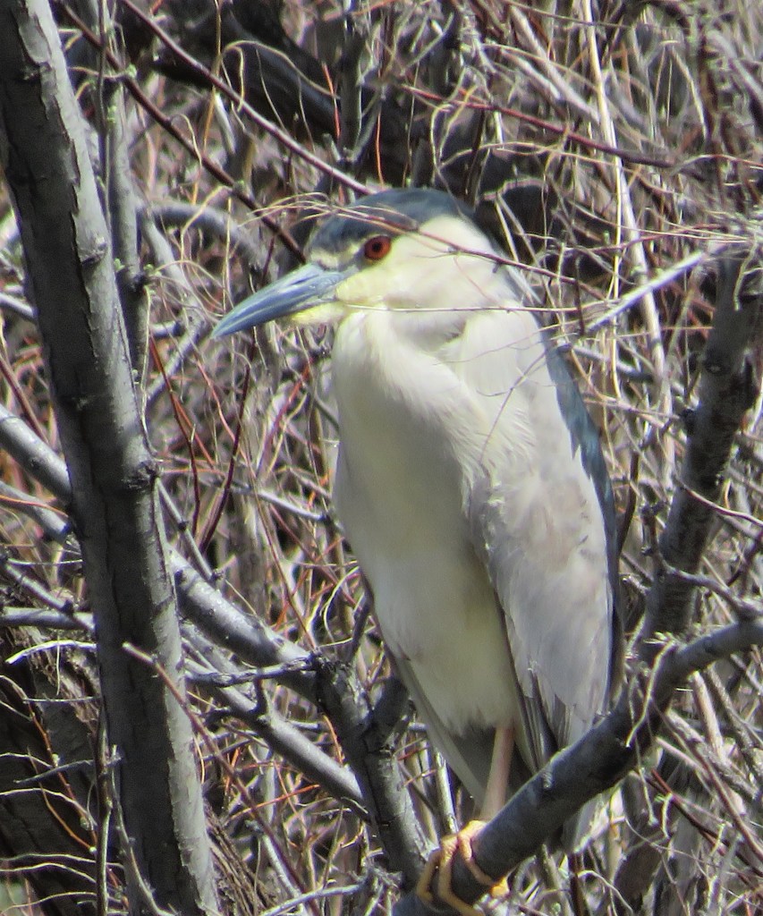 We have lived in our house for 16 years, and there is still always something new to see. The other day, we were walking Juneau and I discovered yet another new bird, or at least new for me. He was pretty far away and was hidden in a tree branch, so he wasn’t easy to see, but I zoomed in with my lens and lo and behold, I discovered we had a new heron in the tree. Larry didn’t see him, and thought I was seeing things until I showed him the pictures. Our new heron is called a Black Crowned Night Heron. He is smaller than our normal blue or grey herons, but just as handsome. The name comes from the fact that they are usually quiet during the day and are more active at night. Black Crowned Night Herons are carnivores, just like other herons. They like to eat frogs, fish, small mammals and even other smaller birds.