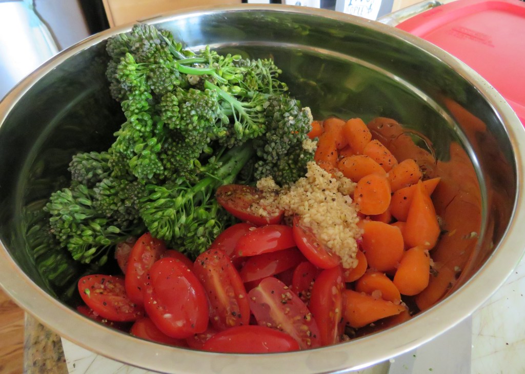 For both the vegetables and the potatoes, I just tossed and coated them with olive oil, salt, pepper and garlic, then roasted them at 425* F or 219* C for about 40-45 minutes.