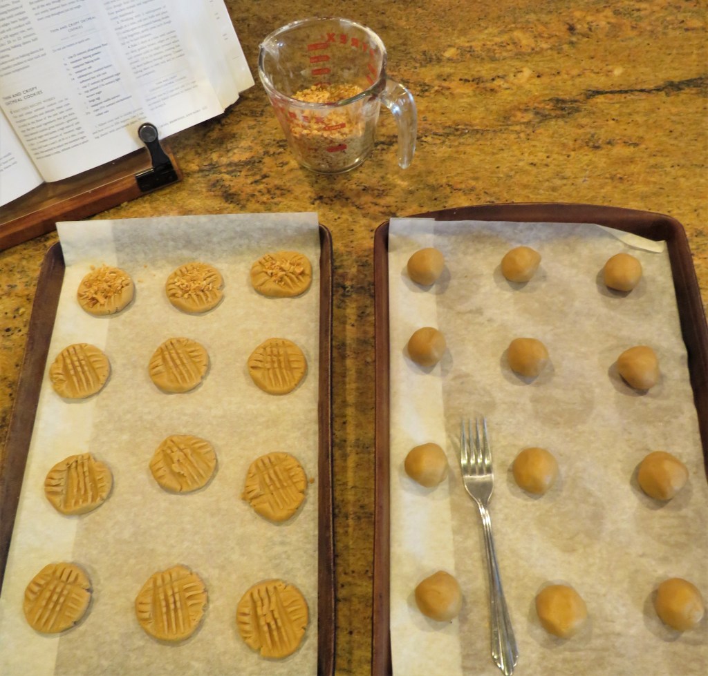 Have you ever wondered why peanut butter cookies have the forked criss-cross on top? I know I have. Peanut butter is a pretty dense ingredient. When you add it to cookie dough the cookies will bake with this density. Adding the criss-cross pattern or “hash marks” to your cookiesΒ allows them to bake evenly. So there you go. Now we all know. π