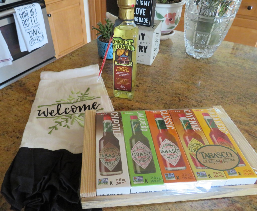 Let me take you back just a bit first to give you the scoop. ๐ A few days before Karen and Lori arrived, Julia and Bruce came over and we enjoyed each other’s company over a Southwestern steak salad and fun and games. Southwestern Succotash and Steakย Salad Julia is ALWAYS so sweet and thoughtful, and she brought some yummy gifts with her. She gave me a sample pack of Tabasco, from their recent touring of the Tabasco plant in Louisiana, as well as some pecan oil.