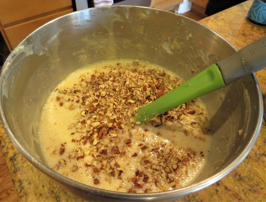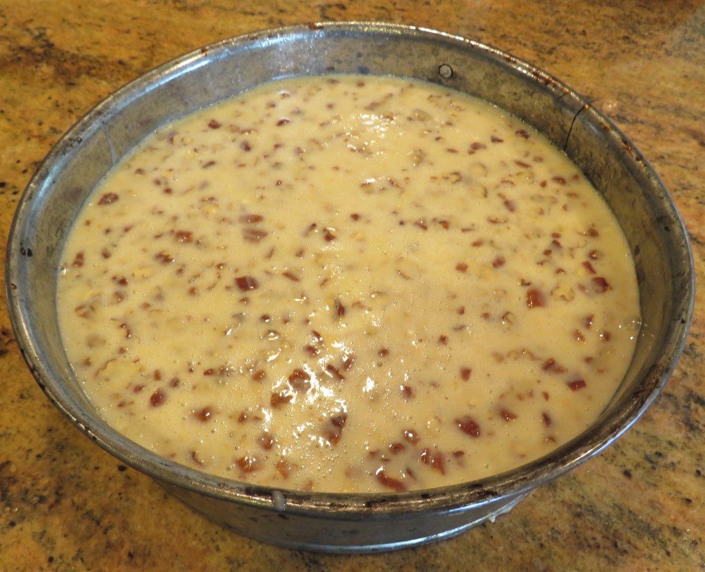 Add the chopped pecans and gently fold into the batter. Pour into the prepared cake pan. The batter is supposed to be a thin batter.