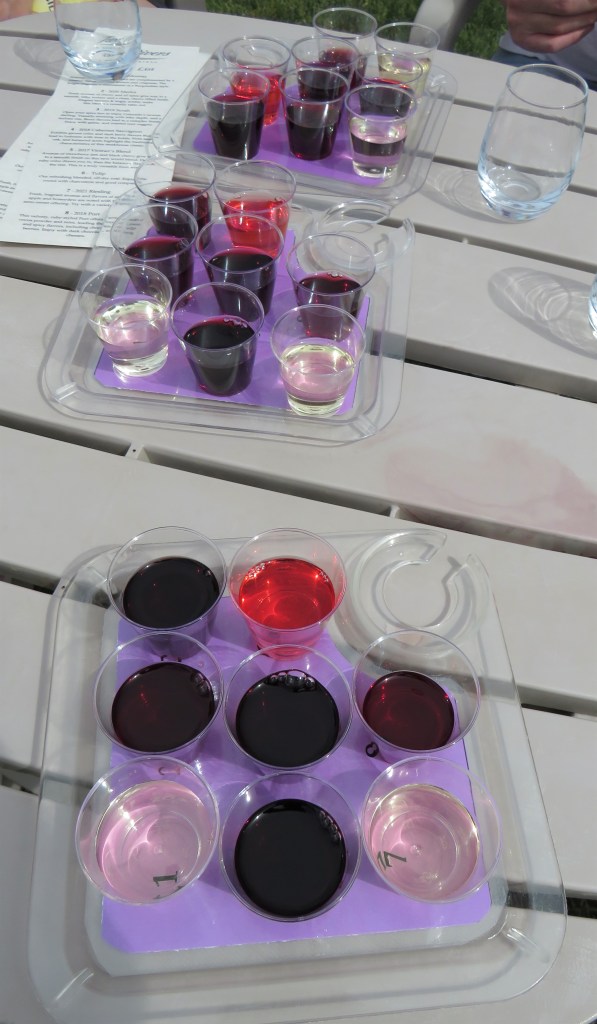 Though there were 6 of us, we decided to share a combination of 4 wine flights. There were 8 different samples per flight, ranging from sweet to dry, in white, pink and red. Some of us are red wine drinkers, some of us are white wine drinkers, and then there is me, who will try it all if the name wine is in the title. There was a little something for everyone in these flights. Though in all honesty, I am really more of a dry white wine drinker than anything. I don’t care for sweet wines at all, regardless of their color, unless it is port. π