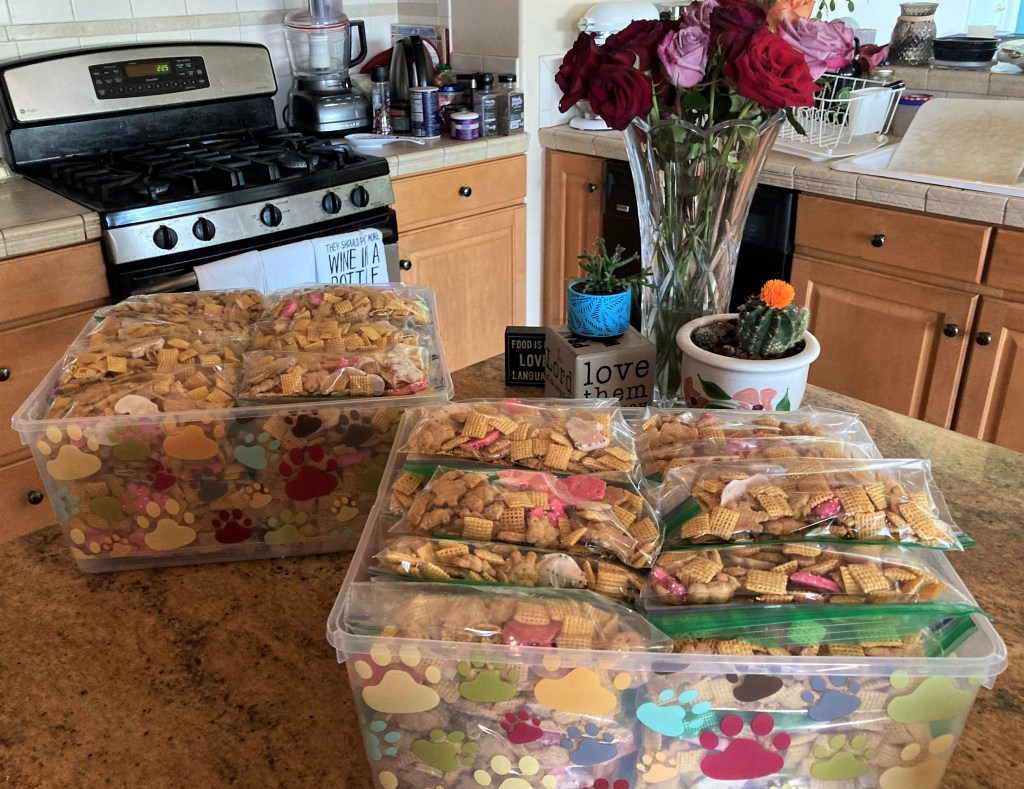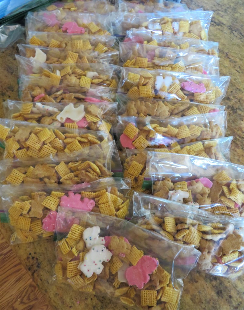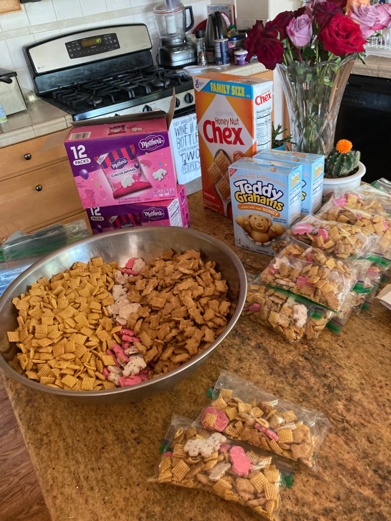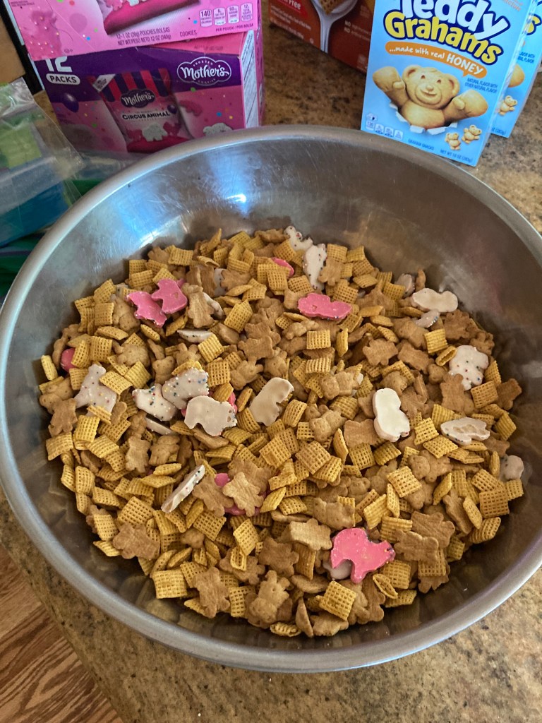 The first batch of goodies were bags of circus treats. They were easy to make, there was just a lot of them. They are a mixture of Honey Chex, Teddy Grahams and Circus Cookies all tossed together.