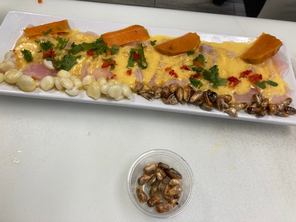 This Peruvian ceviche was made with sea bass, a special kind of Peruvian corn similar to hominy, grilled corn, sweet potatoes, peppers and huancaina sauce and cilantro. It was fun seeing Chef Hernandez prepare it right in front of me too. We ordered two of these specialty ceviches. !Esta mui delicioso!