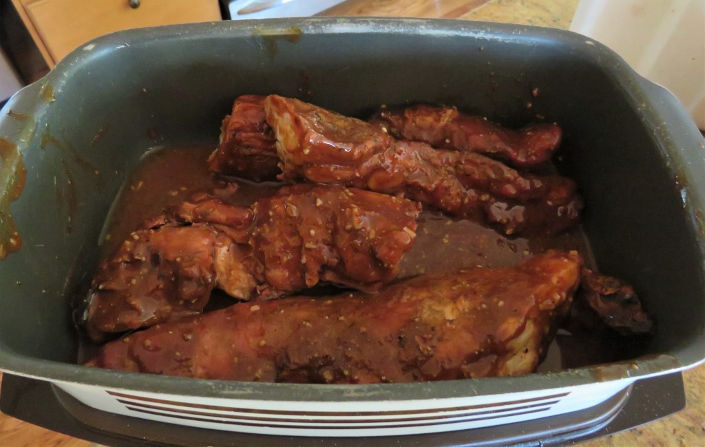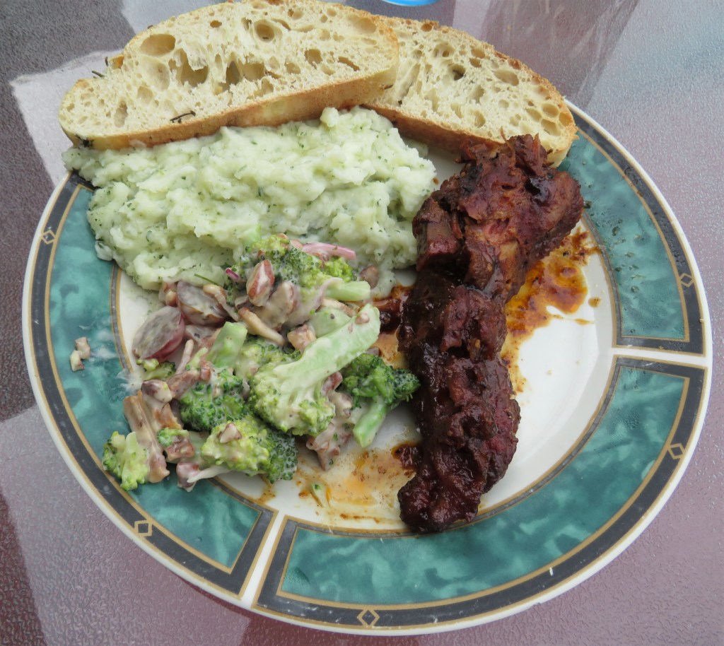 Larry had smoked some ribs the other day, but they were still tough and needed to be slow cooked. I did just that too. I slow cooked them in a spicy, smoky sauce for about 4-5 hours and they came out so tender. It was yet another oppressively hot day, so something that did not require me standing over a hot stove was a perfect choice for dinner. I made a cool broccoli and grape salad to go with it as well. Again, something cool was the plan.
