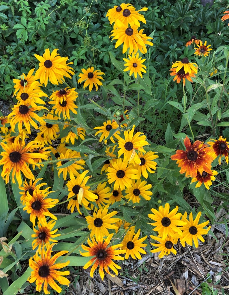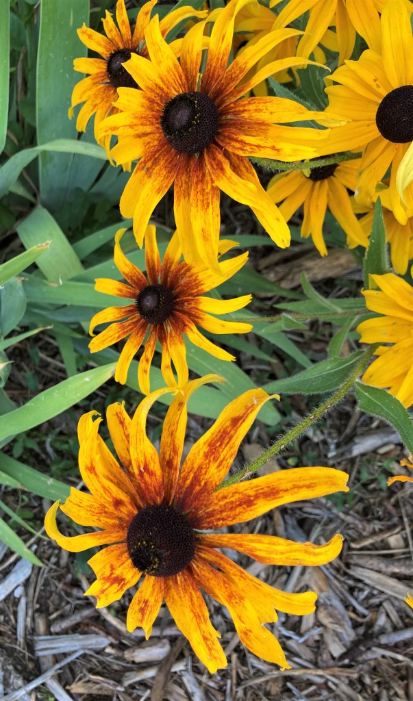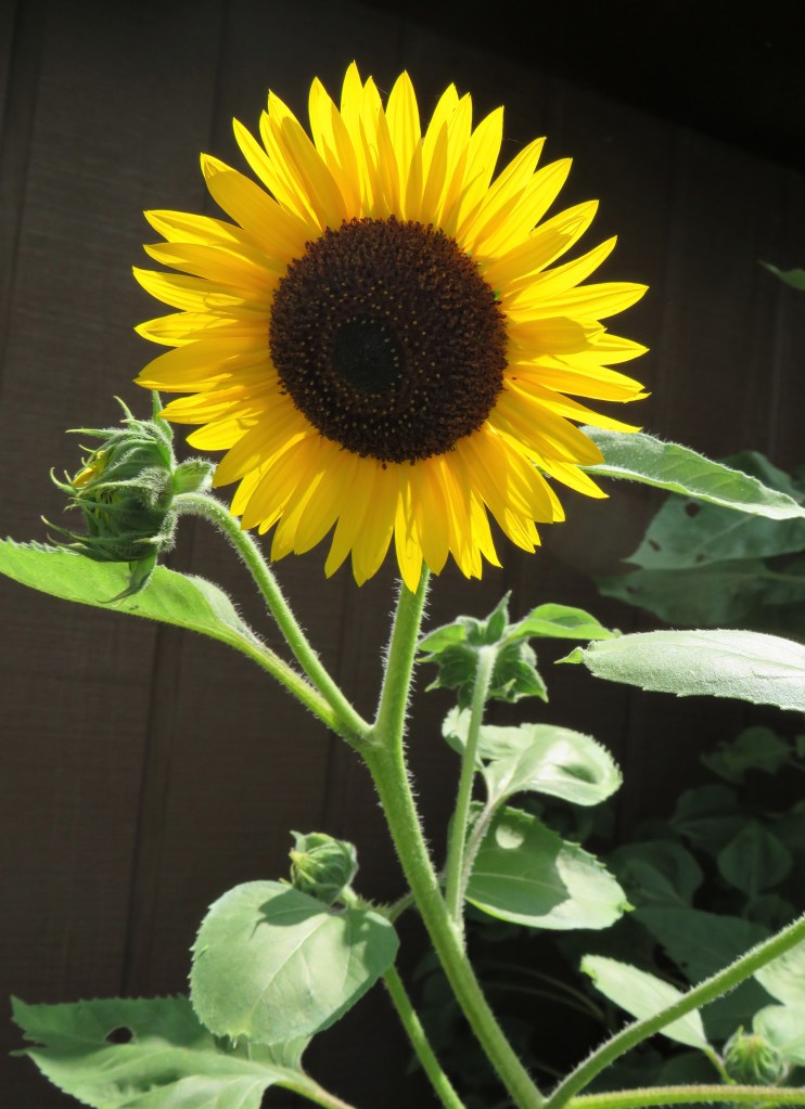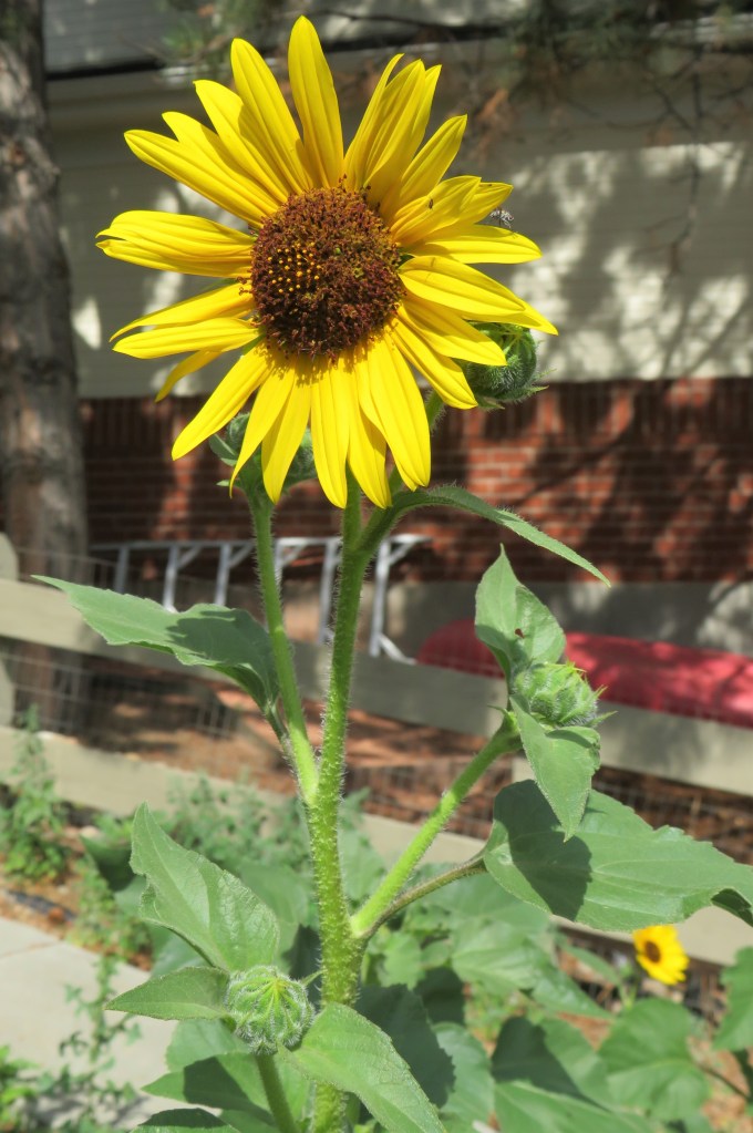 Even my own sunflowers are shining brightly. Dorrie and Juneau had to check them out too.