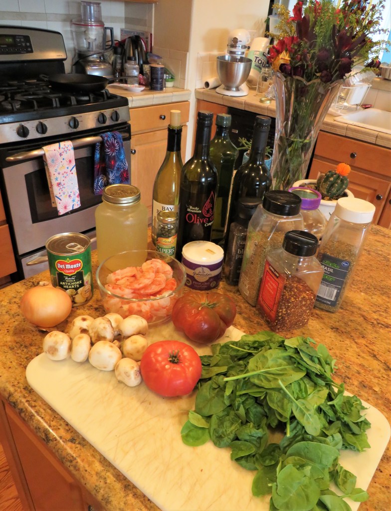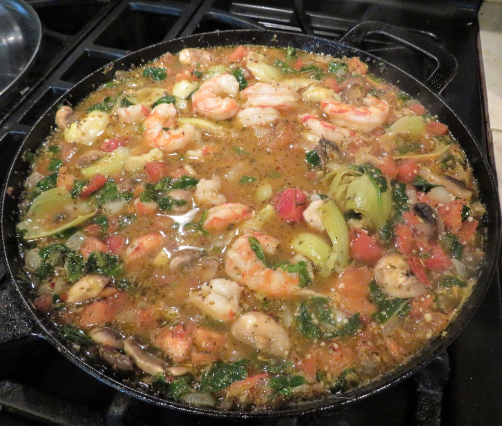 I made Tuscan styled shrimp, or at least that’s what I am calling it, and it was oh so good. I loaded it up with spinach, artichoke hearts, garlic, onions, tomatoes, mushrooms and of course lots of huge jumbo shrimp. Shrimp and seafood are not traditionally part of the Tuscan diet, as Tuscany is landlocked and plunged in the center of rolling hills, but today, anything goes. Traditional Tuscan food is more centered around meats, cheeses, wild game, and of course fresh vegetables and bread; all the foods that come from the land.