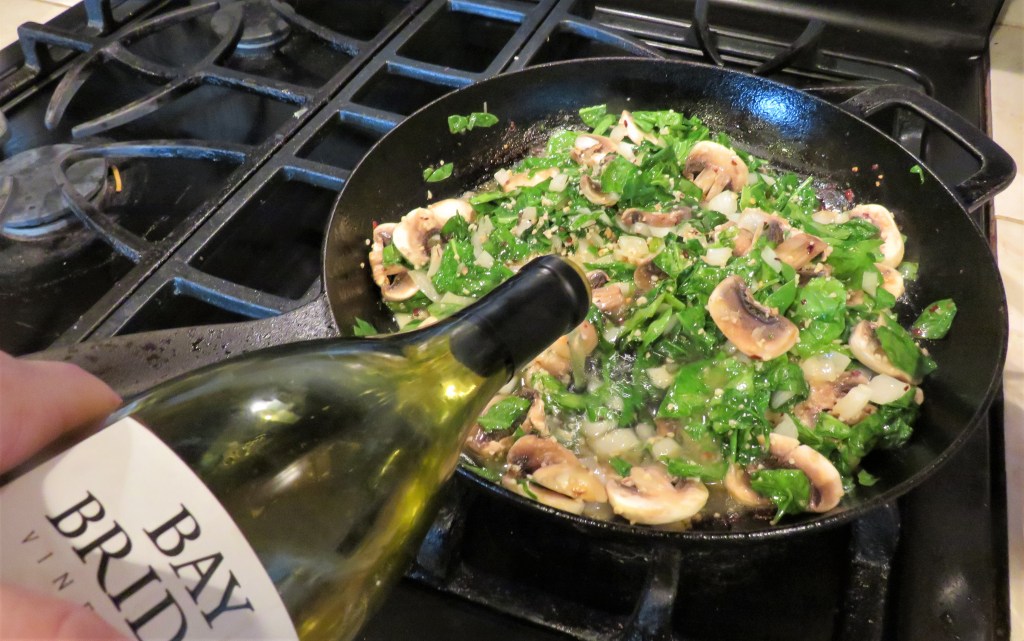 Saute the onions and garlic for about 2 minutes, then add the spinach and mushrooms. Cook for an additional 5-7 minutes, stirring frequently.