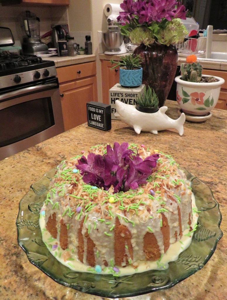 Pour the icing over the cake, allowing it to run down the sides. Sprinkle the toasted coconut all around the top and add colored sprinkles if you like, to make it more fun and festive.