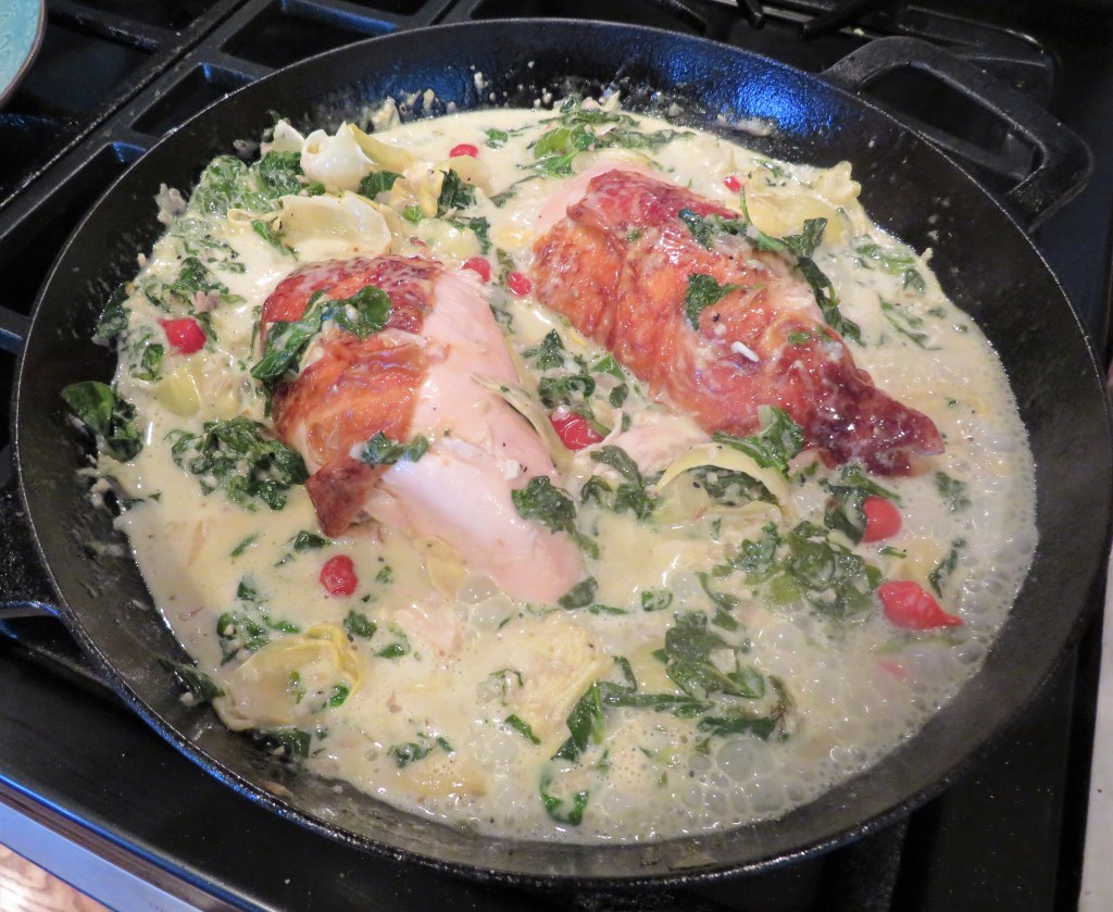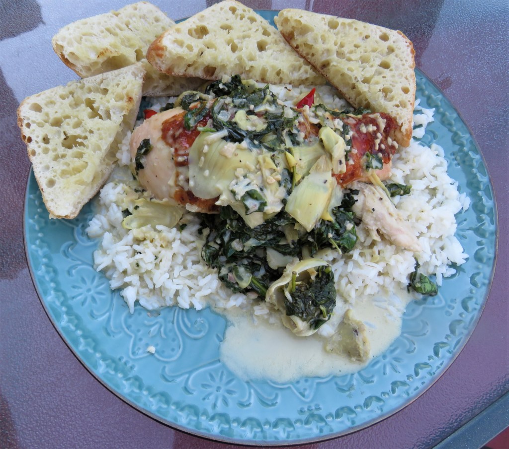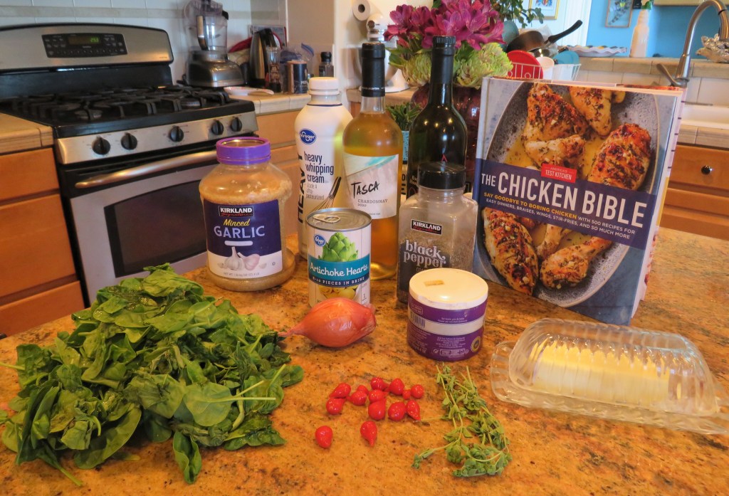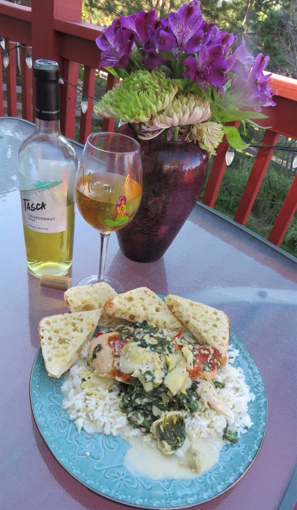 This time I made chicken with creamy spinach and artichokes. I served it all over rice with a delicious crisp chardonnay to complete the meal.