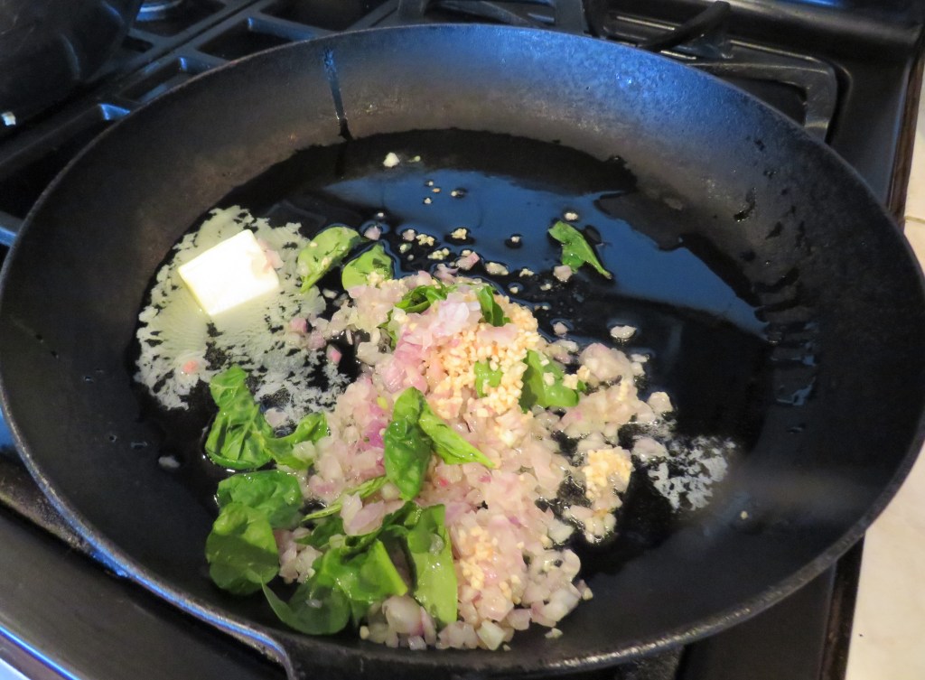 Get a skillet very hot, then add the butter and olive oil. Cook the shallots and garlic and cook for about 2-3 minutes.