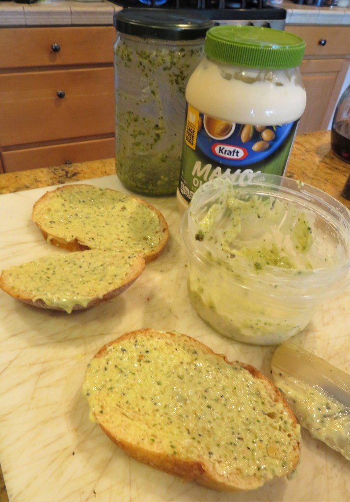 Spread some of the mayonnaise on both sides of the bread slices and either grill or bake until lightly browned and crispy. Then cut into chunks. I had a little leftover pesto sauce that I added to the mayonnaise to make pesto croutons.
