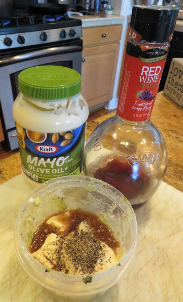 Combine the rest of the mayonnaise, salt, pepper and red wine vinegar to make your dressing.