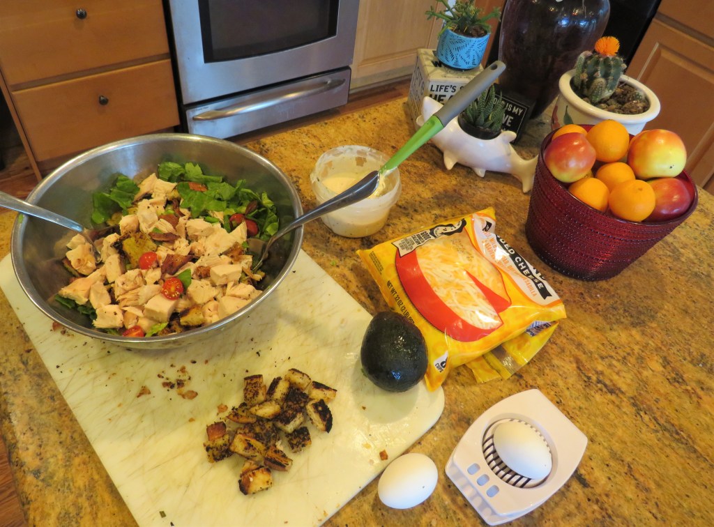 Toss everything together, right before you are ready to serve, and you now have a chicken BLT salad. You can toss everything else together, and hold the croutons and dressing out until just ready to serve too.