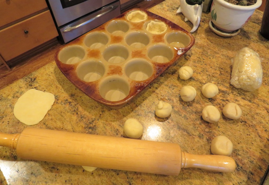 After letting the dough set in the refrigerator for about 30 minutes or so, roll it out very thin and cut it into rounds, then press them into the prepared muffin tins.