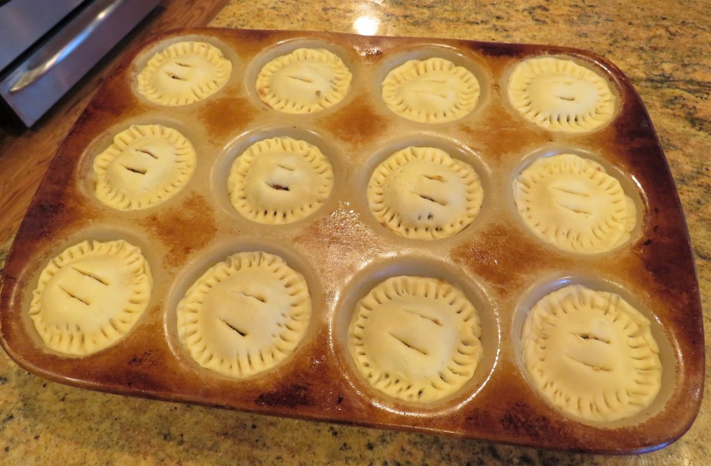 Add about 2 TBSP of filling to each cup then top with another dough round. Press firmly into place and crimp with the edge of a fork. Slice a couple of slits on the top of each pie to allow the gases to escape while cooking.