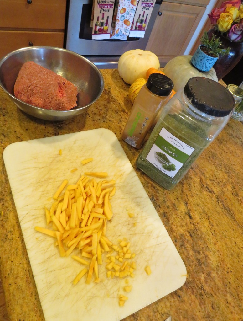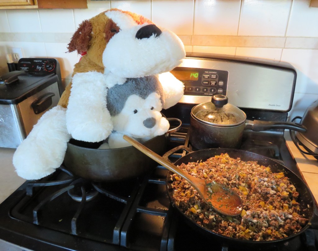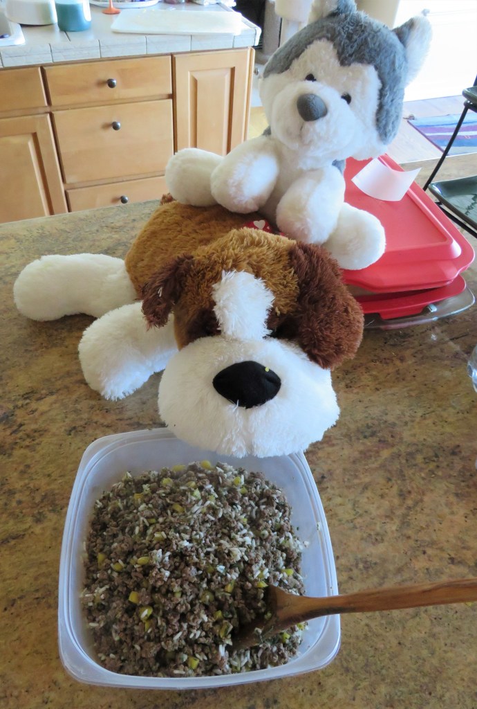 It’s been a while since I last shared something I made for the “kids”. For the most part, I cook their wet dog food about once a week, though I haven’t made anything really different for them lately. But it’s pumpkin season, and pumpkin is very good for them, so I made them some pumpkin and hamburger with rice, cinnamon, and parsley all mixed in, all of which are very good for the “kids”.