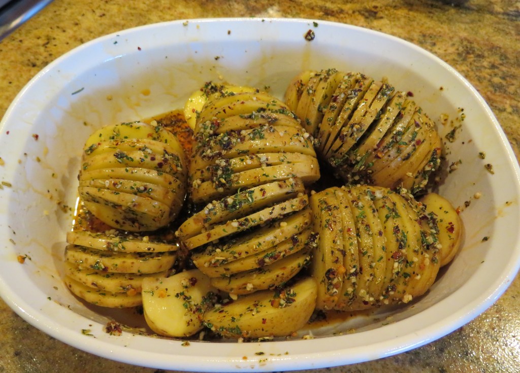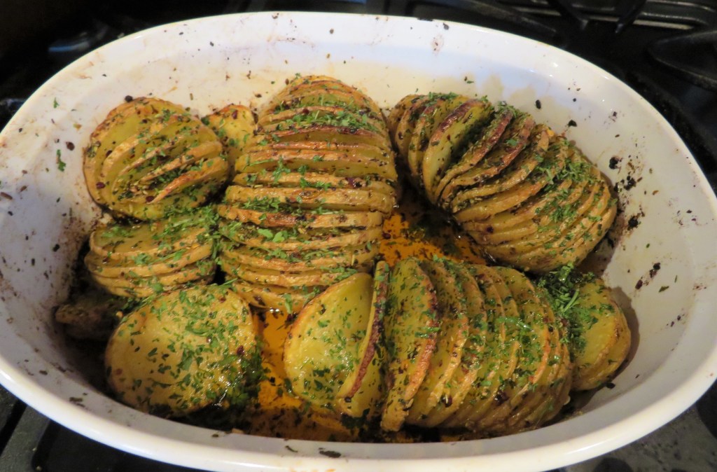 Thoroughly wash and pat dry the potatoes with a paper towel. Then slice the potatoes in thin slices, without cutting all the way trough them. Place them in an oiled baking dish and gently fan the potatoes out. No problem if they break apart. Just keep them together as best as you can.
