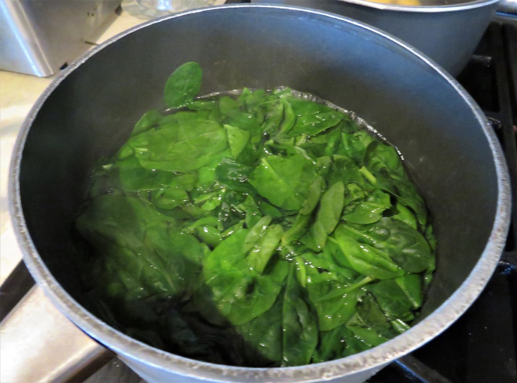 While the onions are cooking, blanch the spinach in boiling hot water for about 10 seconds, then drain and puree, or chop into a fine chop.