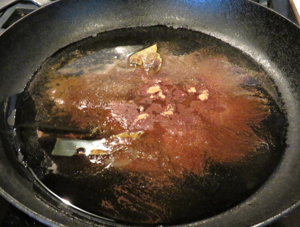 When you are ready to start cooking, get a large skillet very hot and add the oil, bay leaves, cinnamon, cloves and cardamom. Cook for about 1-2 minutes, or until the spices become very aromatic.