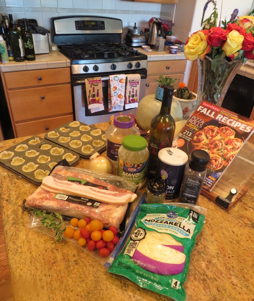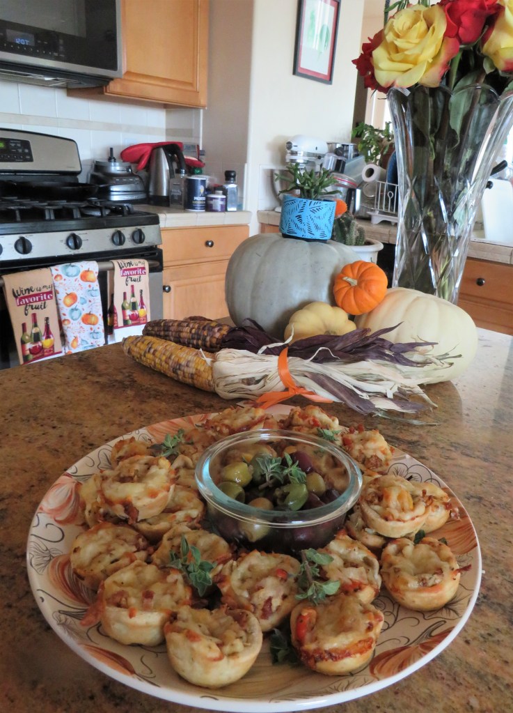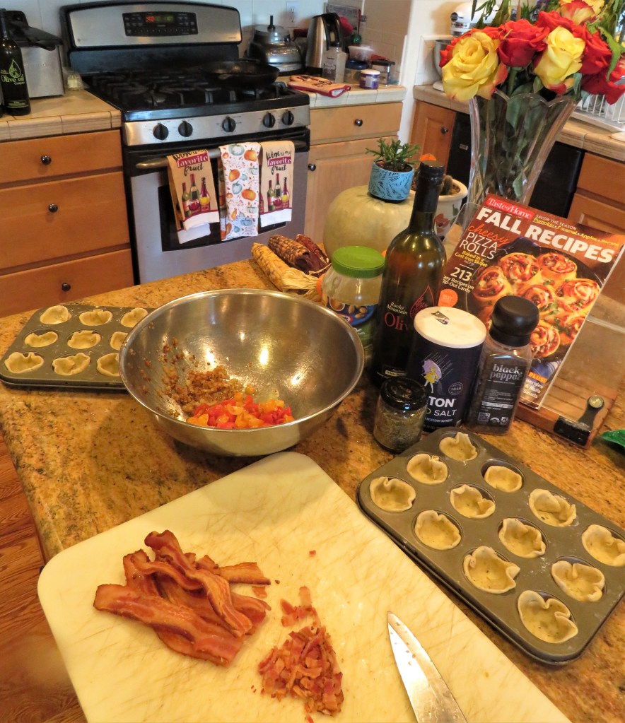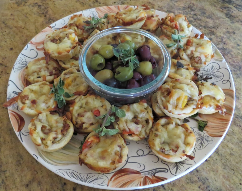I usually make some kind of a charcuterie tray because it is easy to make, travels well, and goes well with wine. But this time I decided to make something a little different instead. I still had appetizers and nibbles, including mixed nuts, olives and dolmas (stuffed grapeleaves), but I made some tomato bacon bites too. They were easy to make and tasted really good as well. That make them a win/win for me.