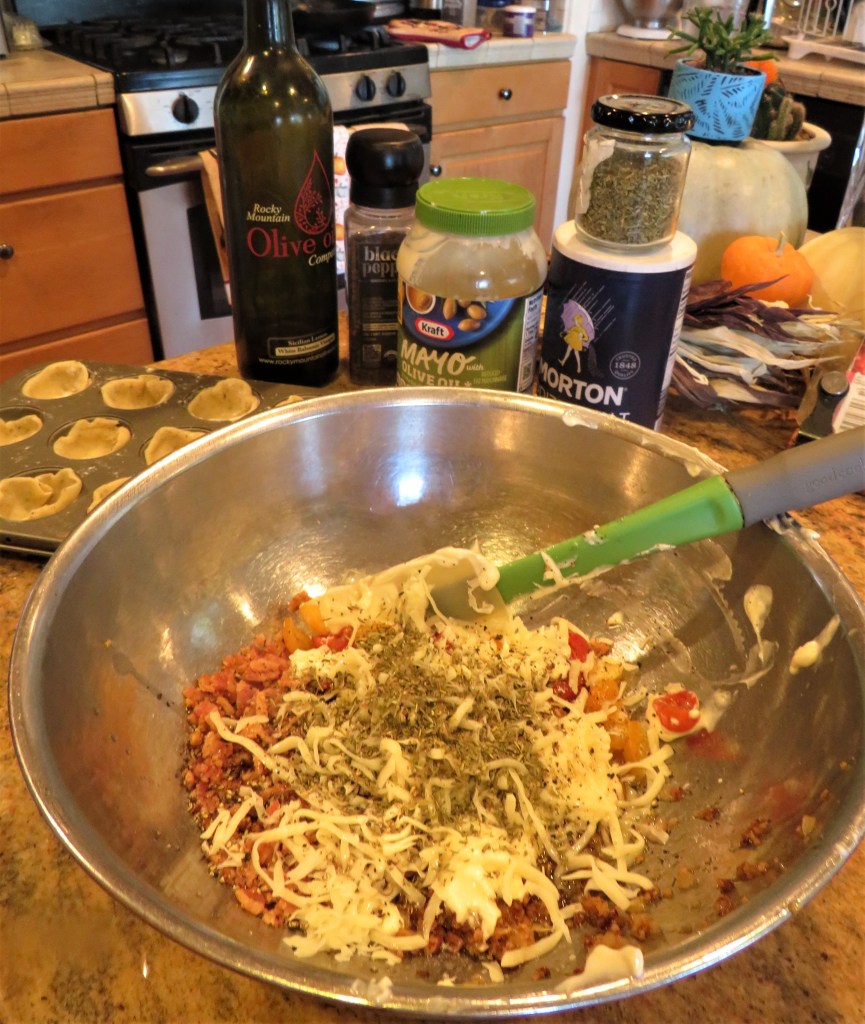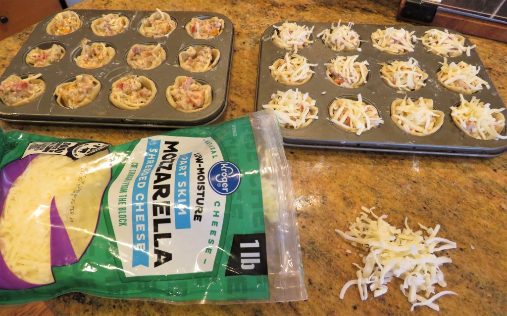 Fill the cups with the bacon and tomato mixture, with about 1-2 tsp of filling per cup. Once the cups are filled, top them with additional cheese.