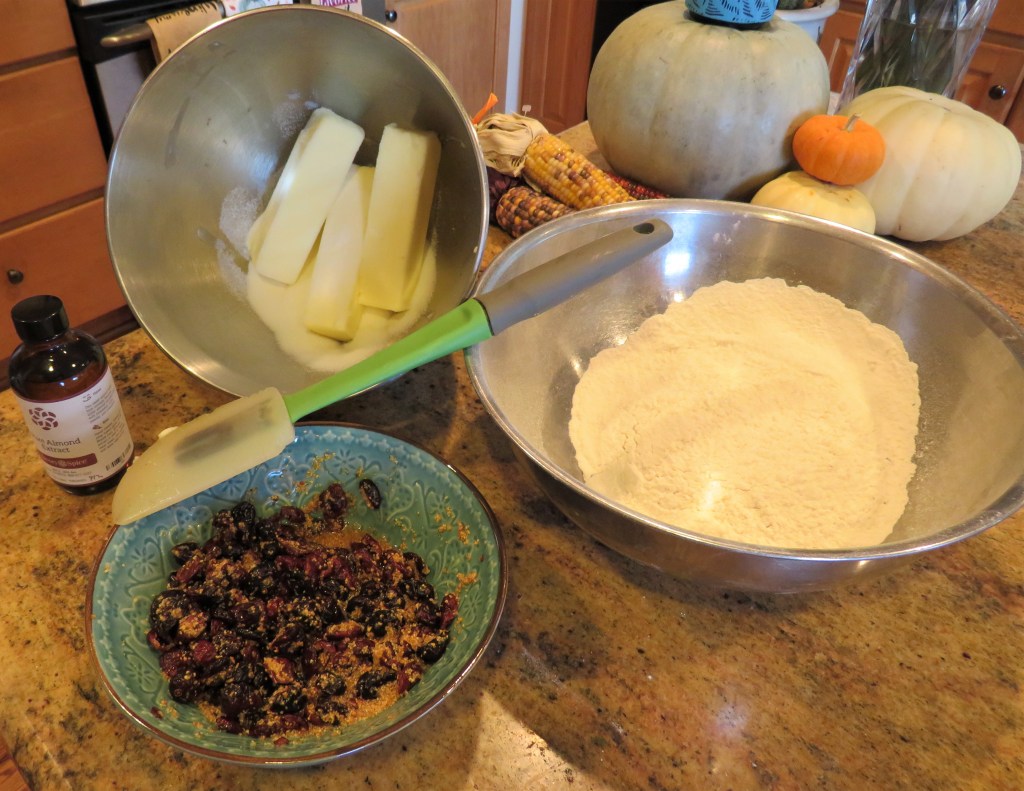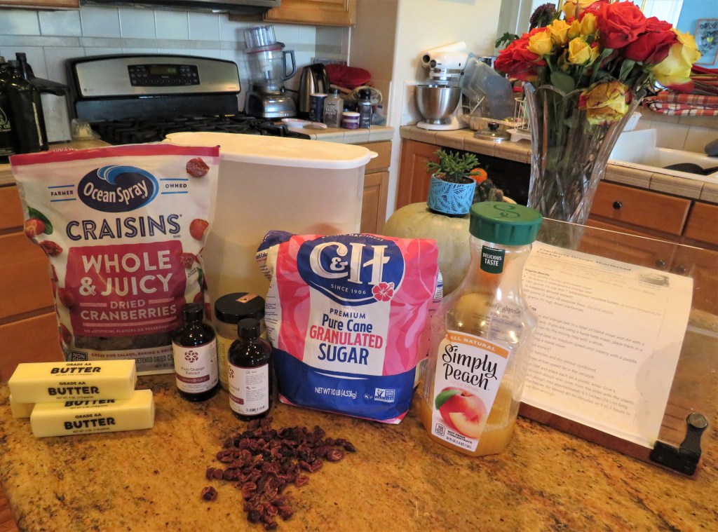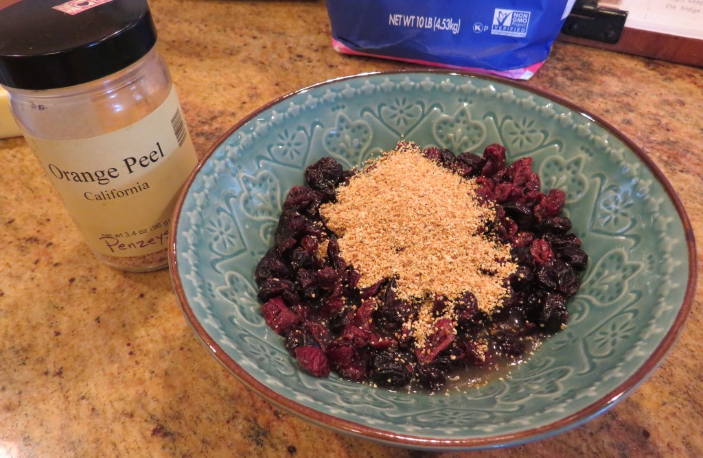 Add the juice, orange zest and the orange extract to the cranberries and stick in the microwave for about 30 seconds. Then let rest for a bit. This is to plump up the cranberries and make them softer, juicier, and more flavorful.