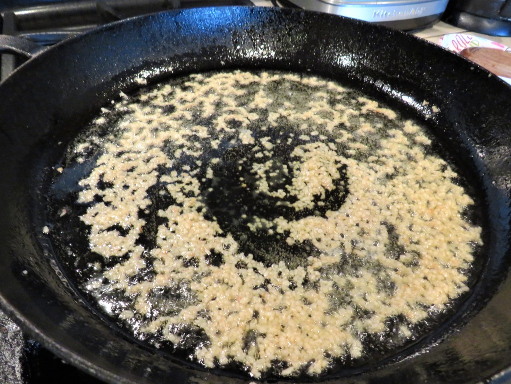 While the meat is setting, make the sauce. Get a large skillet or pan very hot, then add the olive oil and garlic. Cook for about 2-3 minutes, or until the garlic becomes aromatic.